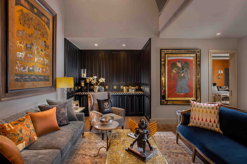 In the bar area, a streamlined sofa is paired with another with grand contours, the sofa seat is upholstered in two different materials – plane velvet on the inside and gorgeous printed fabric on the outside. Rich materials are balanced with natural ones. Modern artwork is coupled with folklore paintings embellished with elaborate frames and artwork on canvas with wooden frames in antique gold polish, distressed mirrors, and antique brass rivets. Neutral painted walls contrast with wood panelings on the other side. The wall paneling in black around the bar counter with an inlaid stone top presents a striking statement with golden accents.
