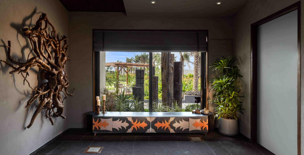 Astonishing design features, like an over-the-top quirky wallpaper, waterfall surface dining table, and specially designed accessories and artifacts grab attention, even as muted organic elements gently direct your eyes to the natural setting.