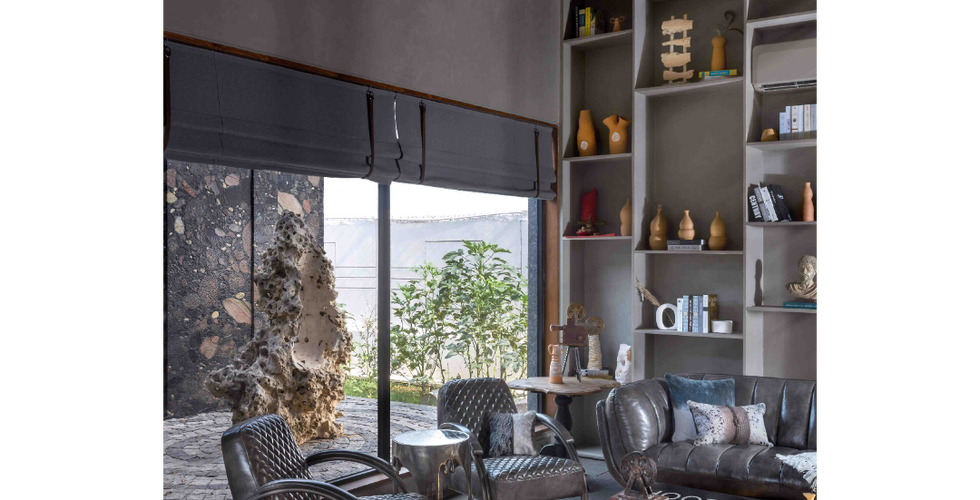 The den or the informal living room is steeped in shades of grey exhibiting a chic neutral vibe. A towering shadowbox shelving unit forms a gorgeous background. An array of terracotta artifacts in a multitude of shapes, specially designed and gotten made by a local artisan, add a charming look. The flooring in rough brown Kota stone accented with a highlighter with a pateena finish, and interlaid with wooden tiles further sets a muted backdrop. The sloped ceiling has been done up using two materials – wood as a highlighter element, and the rest rendered as a textured surface. The neutral atmosphere bristles with a raw edge. As a result, the eye is guided towards the verdant views out of the large windows. They beautifully frame the vibrant outdoors.