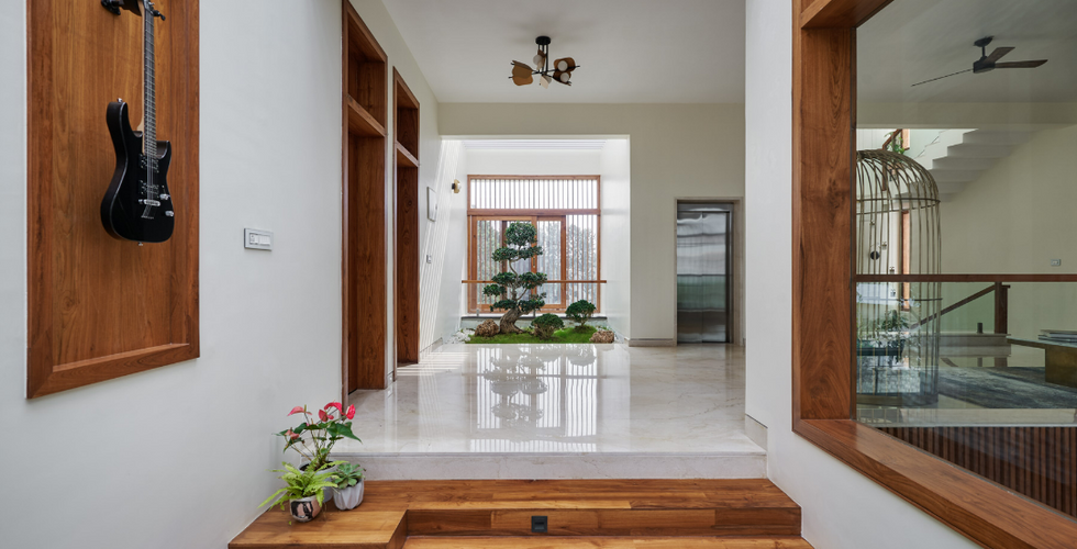 The Material palette's main components are concrete, wood, and marble. Throughout the house, a warm and delicate colour tone has been maintained. Over the beautiful and delicate grey and white tones, the wood functions as the dominating and predominant tone. From the Foyer wall to the flamboyant ceilings over the hallways, the house's interiors include a fair number of timber features. This colour palette, which includes some green, creates an intimate connection.