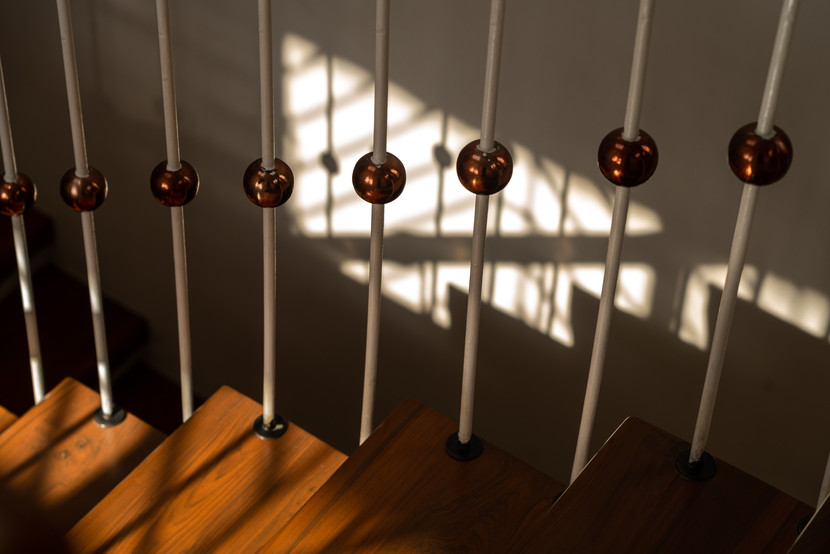 The white painted underside of the staircase almost merges it with the rest of the shell while accentuating the volume of the core. The walls in common spaces are adorned with custom-made terracotta lamps and artworks to further denote the authenticity in the use of materials in the spaces.
