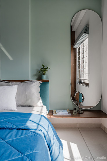 The space planning for the bedrooms is accomplished with a focus on functionally & uncluttered spaces using simple, sleek lines. The furniture design is kept clean using a combination of engineered wood & teakwood for profile handles to optimize the cost. The color palette here is rooted in nature with earthy green & aquamarine tones against primary neutral tones of white & wood, complemented by plants & accent lights.