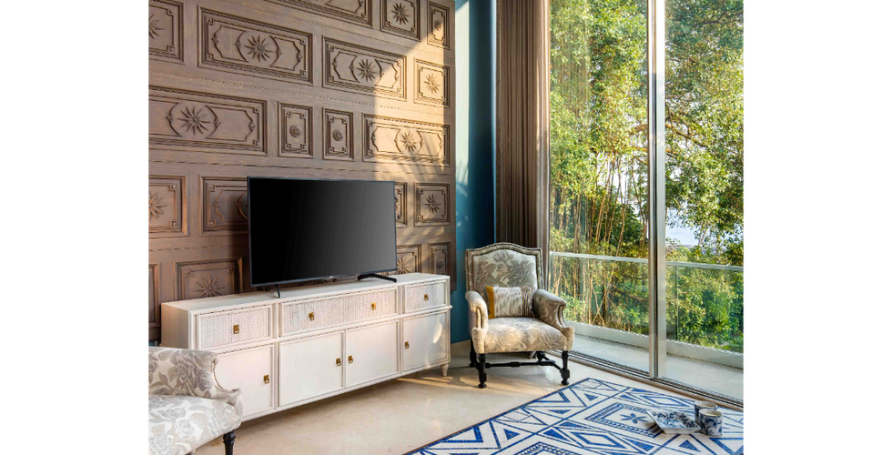 Interestingly, the bungalow stands on stilts, so we used half of the stilt area to carve out a dining room, bar lounge and courtyard. Surrounded by greenery and furnished with classic contemporary furniture, the bar lounge is a relaxed space with a leather bar cabinet from Trunks Company. Most of the other furniture, accessories and lights seen across the home is custom made by us at Beyond Designs, while the carpets are sourced from The Carpet Cellar. The overall decor is an amalgamation of exquisitely crafted furniture, unique prints on fabrics and European refinement. Even though white is the base, the property boasts abundant textural flair and an authentic, intimate vibe, owing to the use of quality natural materials such as marble, wood and local stones.