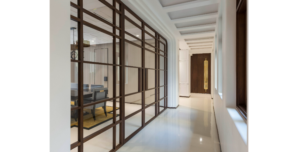 The wooden screens in classic geometric patterns work as partitions to transform private rooms into an open and flowing public space with their varying wood finishes adding a subtle texture and depth. The enclosed balcony also works as a study, to just read, watch TV, think or gaze out at the spectacular view.