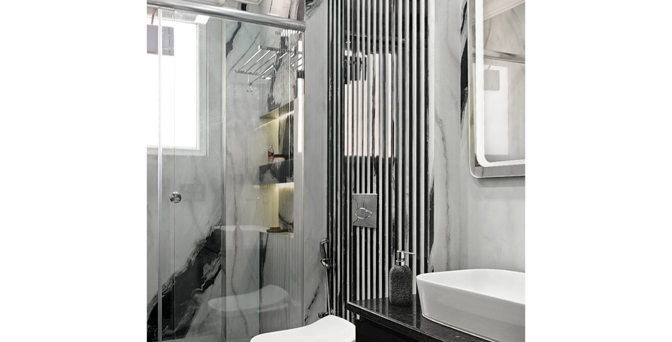 This home is planned in a neo-classical theme. Classical mouldings have been used with modern tinted mirrors. The open plan kitchen just makes the entire space look more open and bigger. The breakfast table cum bar storage space in black flutes connects the lobby and the kitchen area.