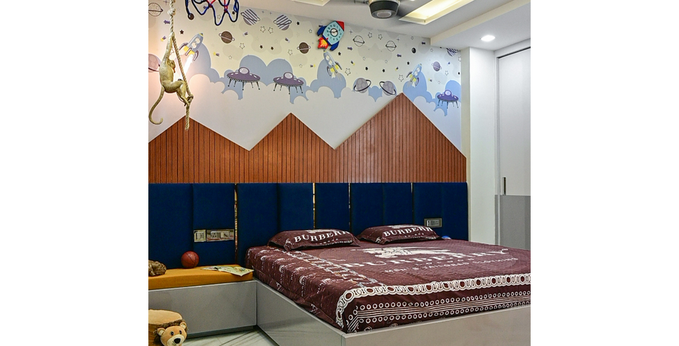 The kid's bedroom is a lively space done in grey and blue. The mountains and the spaceship wallpaper with a monkey hanging light just creates an earthy terrestrial vibe.
