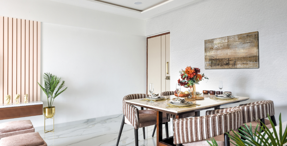 Upon entering, the vista opens up and the true power of beige resonates in the mind. The living space and dining area seamlessly blend into each other to create one family space. The tv unit exudes a soft glow echo through the use of cream and brown paint applied on grooves with a patch of marble cladding, which was then enhanced by the various elements across the clan. The flooring adds little drama which created pockets of color and vibrancy, which contrasted sharply with the muted palette.