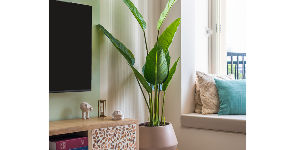 The tv unit has been designed in paint finish using sage green colour with playful claymen characters which sets the overall mood of the house.