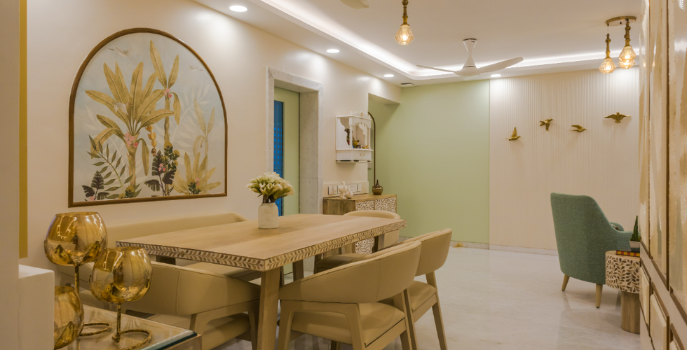 Classical elements like the arched molding are used on the walls of the dining area with complimenting mirrors as the feature element. The dining area is emphasised by a coastal themed feather finish kalakarihath wallpaper.