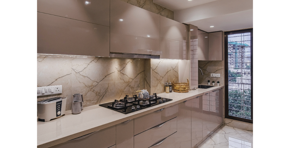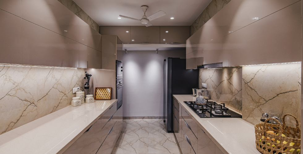 The modular Kitchen cabinets were given a nude colour matching the selected botticino marbonite tile with Blum and Hafele fittings. There was no utility area in the home hence the dryer and the washing machine were fitted in the kitchen. A spacious, functional, plush clutter-free Kitchen is what we desire in modern-day life. And the pictures and videos say it all.