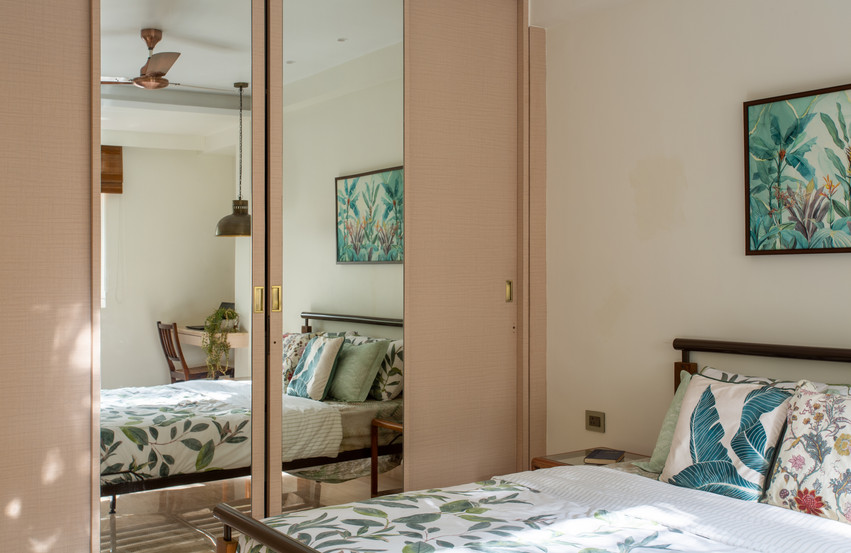 The Guest Bedroom draws its inspiration from the view of palm trees and large tree barks outside its window. The canopy of the trees is translated into the soft furnishings and the artwork in the room. The space is accented by solid wooden chairs and a wooden console and large mirror. The study cum gym hosts sleek white book shelves with exposed metal clamps – displaying books and collectibles of the couple. The highlight of the study is the blinds designed by the architects.