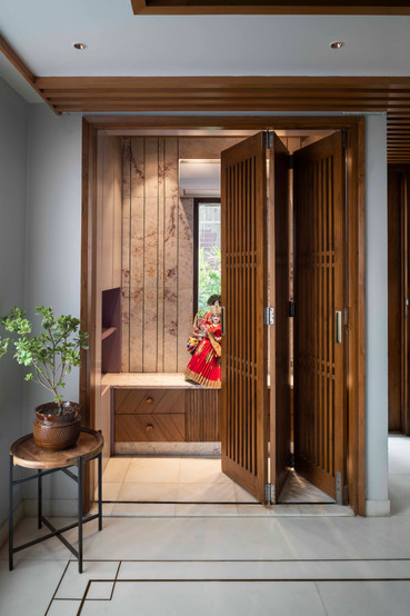 We were inspired by the client’s faith in everyday religious rituals. The mandir takes the most sacred space. Designed east-west, morning sun rays from the rear window touch the floor, bringing a sense of positivity to the house. The designed sliding folding allows for the custom of opening and shutting the doors of the mandir every morning and evening.