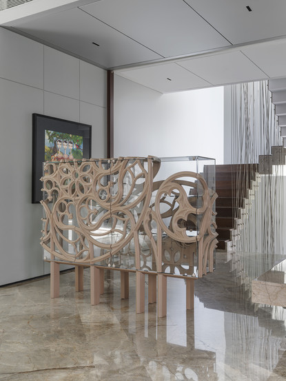 A custom-made poker and pool table complete the entertainment zone, set against a black three-dimensional limestone wall. The stilt floor is a car parking with motorized boundary walls. There is a secondary area with access to the service road.