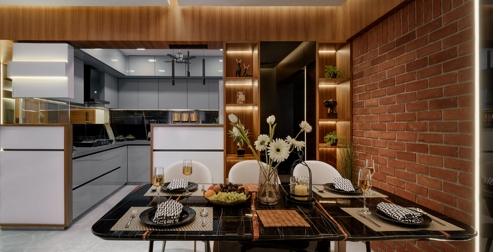 The wall separating the dining area and kitchen was hollowed out in a way that it formed a large, rectangular opening which became a continuous, hassle-free working surface doubling up as a serving counter for the adjoining dining table.