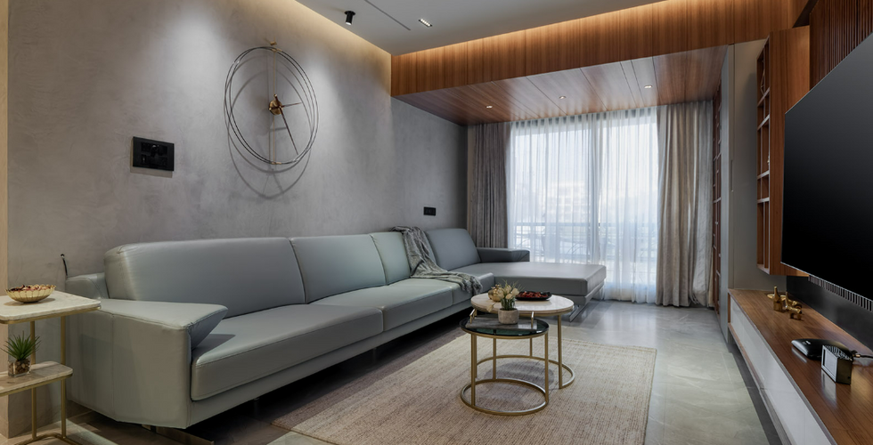 This space opens into the living room that has been done up in hues of grey and pastel blue, layered with the natural warm tones of Teakwood and Statuario Marble. The furniture includes a pastel blue sofa, upholstered grey single seat, and a pair of gold PVD Coated coffee tables. A TV unit made in Corian and panelled with fluted Teakwood and Statuario Marble dominates this space, with a rug from D'decor tying it all together. The modern TV unit transforms into an intricate temple towards the north east corner of the house.